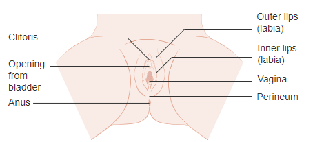 The area surrounding the vaginal opening is called the vulva. Click here for a diagram . The vulva includes two sets of labia (lips). The outer lips are called the labia majora; the inner, thinner ones are the labia minora. The clitoris is found under the hood of the labia minora. The opening of the urethra, the tube through which urine exits the body, is directly in front of the vaginal opening. Behind the vagina is the anus, where stool exits. The area of skin between the vagina and the anus is known as the perineum.