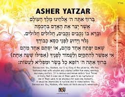 בָּרוּךְ אַתָּה ה’ אֱלקינוּ מֶלֶךְ הָעולָם אֲשֶׁר יָצַר אֶת הָאָדָם בְּחָכְמָה וּבָרָא בו נְקָבִים נְקָבִים חֲלוּלִים חֲלוּלִים. גָּלוּי וְיָדוּעַ לִפְנֵי כִסֵּא כְבודֶךָ שֶׁאִם יִפָּתֵחַ אֶחָד מֵהֶם או יִסָּתֵם אֶחָד מֵהֶם אִי אֶפְשַׁר לְהִתְקַיֵּם וְלַעֲמוד לְפָנֶיךָ אֲפִילוּ שָׁעָה אֶחָת: בָּרוּךְ אַתָּה ה’ רופֵא כָל בָּשר וּמַפְלִיא לַעֲשות: